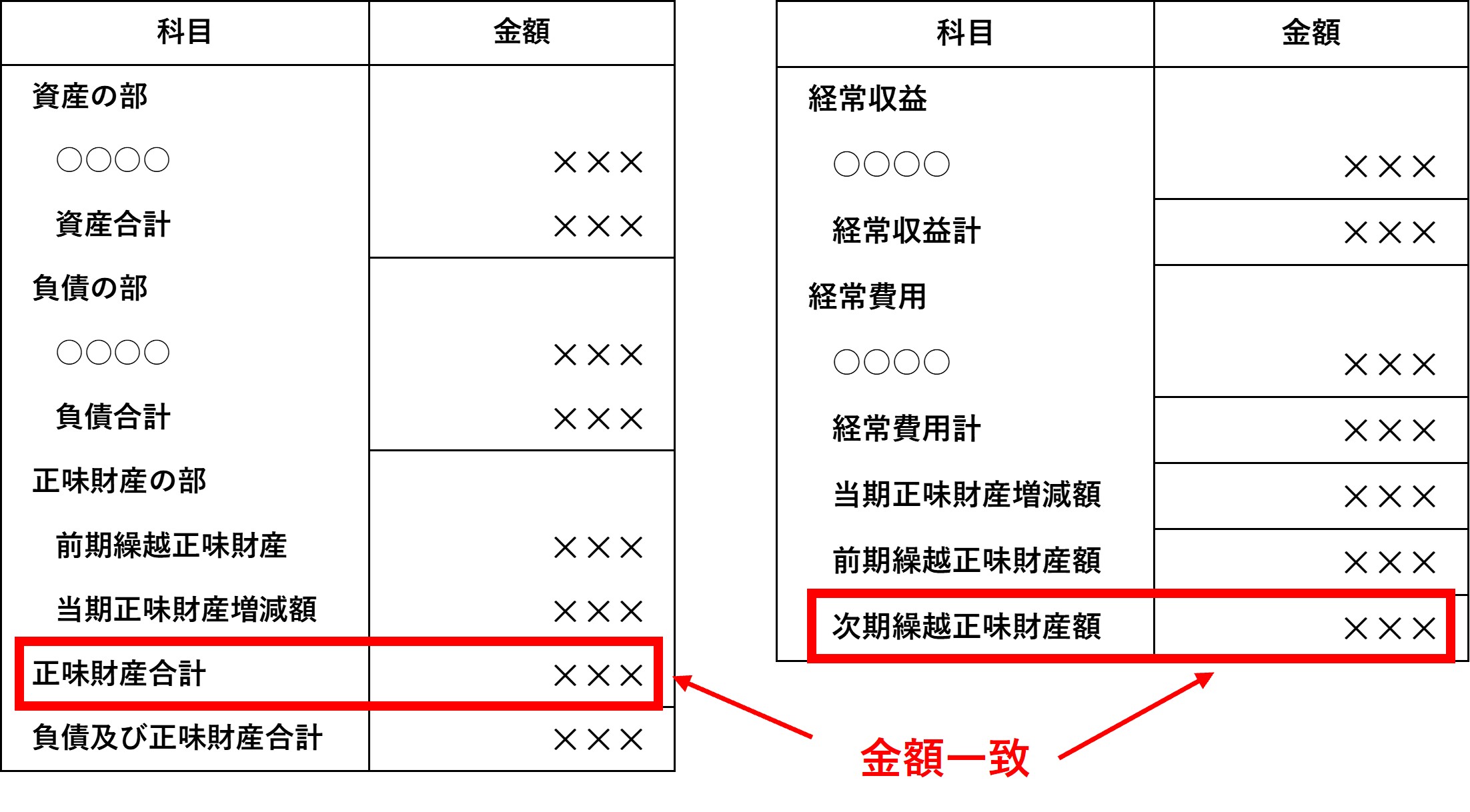また、貸借対照表におきましては資産と負債の差額を純資産ではなく、正味財産と表示します。貸借対照表における正味財産合計の金額と活動計算書における次期繰越正味財産額の金額は一致します。下記はイメージ図です。