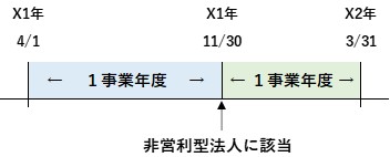この場合、事業年度開始の日から非営利型法人に該当することとなった日までを一事業年度とし、また、その翌日から事業年度終了の日までを一事業年度として確定申告を行うこととなります。例えば3月末日を決算日としている非営利型法人以外の法人が11月30日に理事の人数要件を満たしたことにより、非営利型法人に該当することとなったときは、事業年度は下記のようになります。